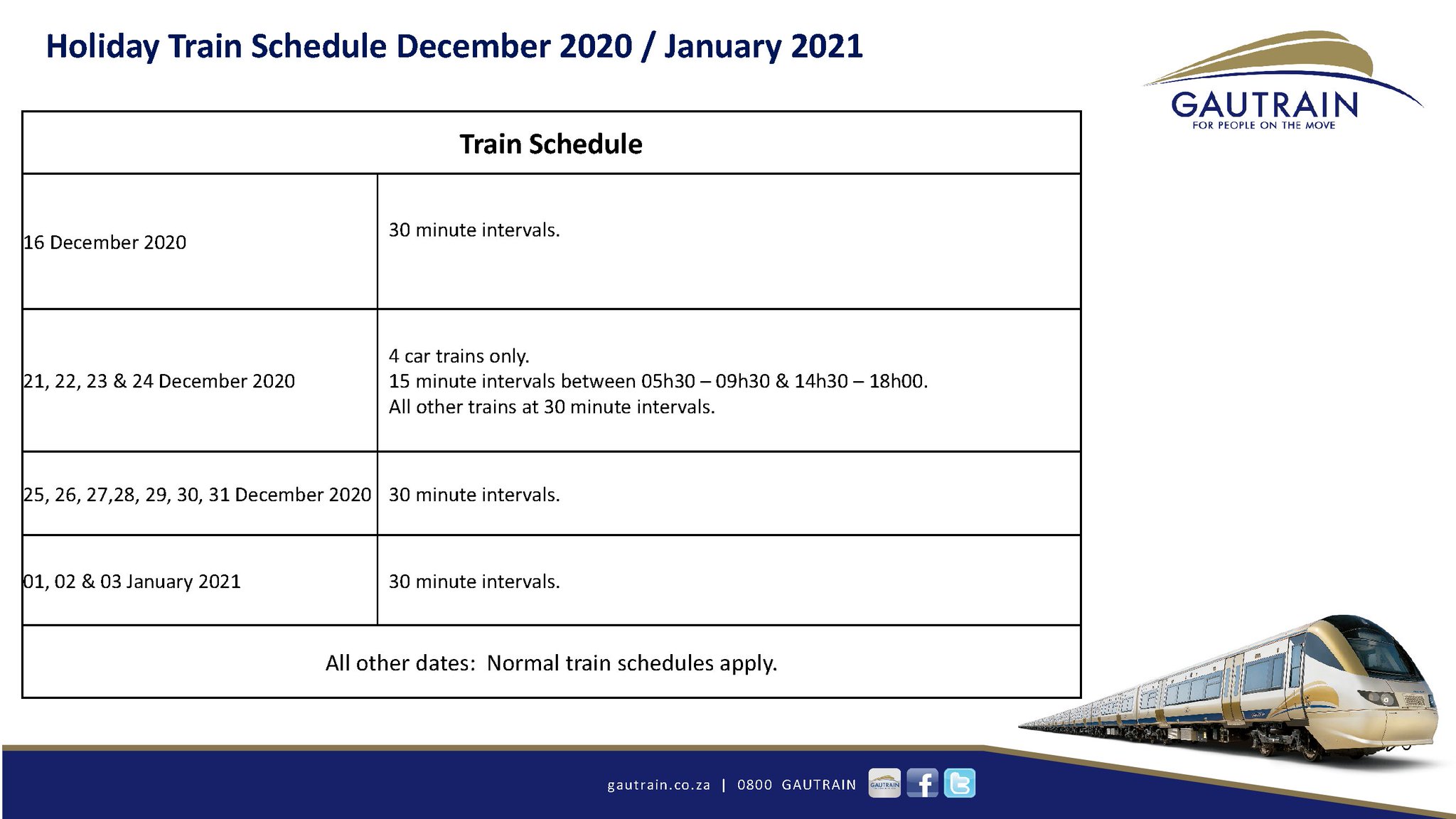 Gautrain On Twitter Please Note Holiday Train Schedule For December 2020 And January 2021 Trains Are Available Everyday Of The Week Including Public Holidays Https T Co Qobkft5ob8