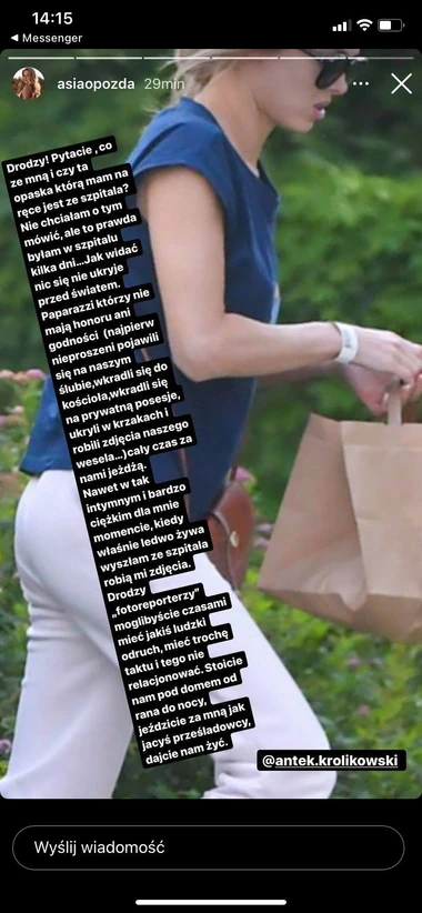 Joanna opozda w szpitalu. Przykre jest że fotoreporterzy nie potrafią uszanować prywatności pary nawet w. Moja córka wczoraj była w szpitalu z ostrymi komplikacjami co wobec stanu w jakim jest spowodowało nasze przerażenie. Jak widać nic się nie ukryje przed światem - czytamy na InstaStories.